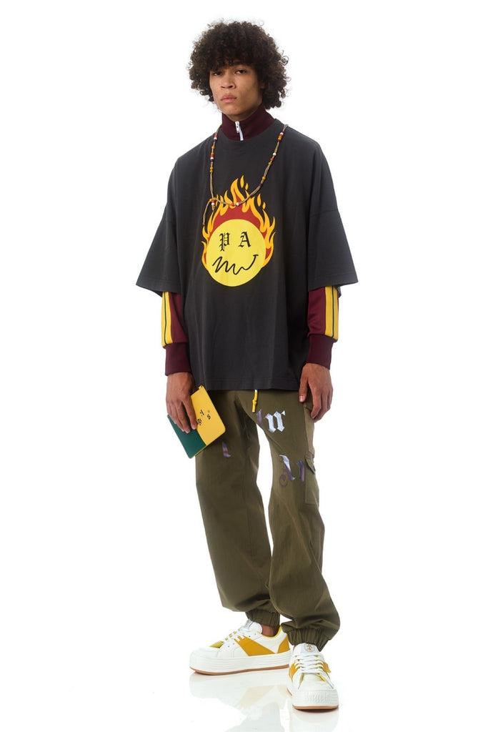 smileyのアイコニックなグラフィックにpalm angelsのシグネチャーであるゴシック調ロゴをミックス、ファイヤーパターンも織りまぜ一層存在感を増した今回のコレクション。ワンアイテムでしっかりと主張できるデザインのため春夏シーズンが待ち遠しくなるコレクションとなっております、今の時期でしたらモノトーンやシンプルになりがちな秋服のアクセントとしても活躍間違いなしです。