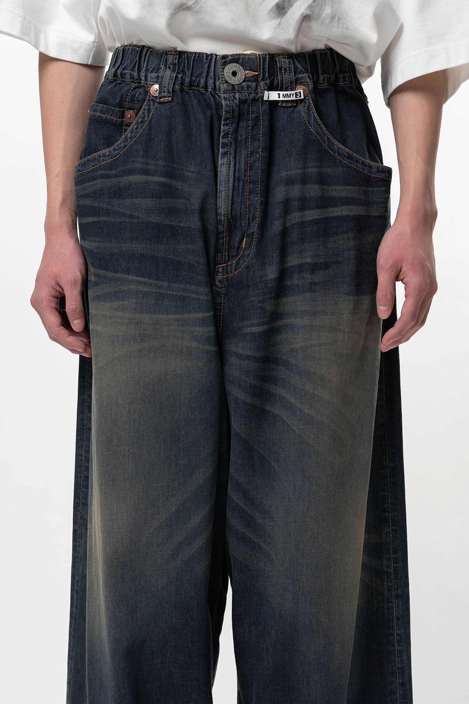 •ライトデニム生地に色落ち加工を施したワイドパンツ。